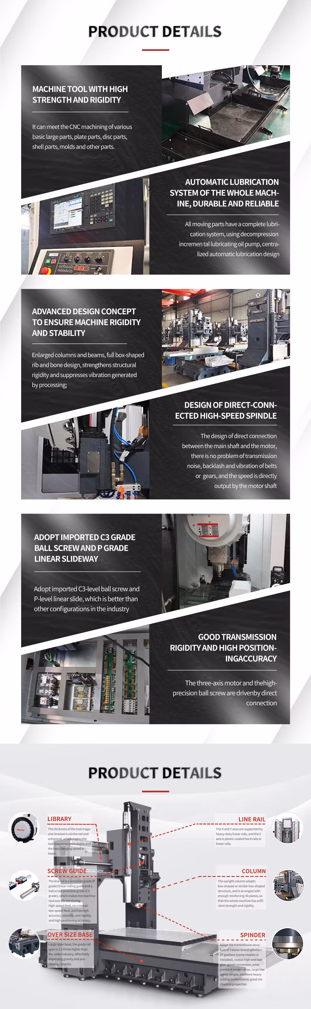 Una macchina per centri di lavoro mobile a portale, adatta per macchine di lavorazione per vari pezzi di grandi dimensioni nel settore aerospaziale, cantieristico, della generazione di energia, delle macchine per l'edilizia, delle locomotive, macchine utensili, macchine tessili, macchine per la stampa, stampi e altre industrie. Il design ad alta resistenza e rigidità della macchina utensile e la struttura del canale di scarico a flusso elevato hanno le caratteristiche di elevata precisione, elevata efficienza, flessibilità e protezione ambientale.
