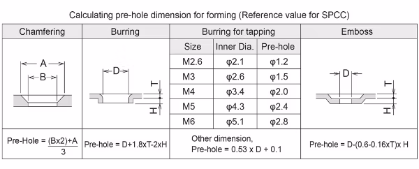 | Durante la lavorazione di formatura, i prefori possono essere lavorati come pre-lavorazione. In tal caso, calcolare i prefori facendo riferimento alla seguente formula di calcolo | |
